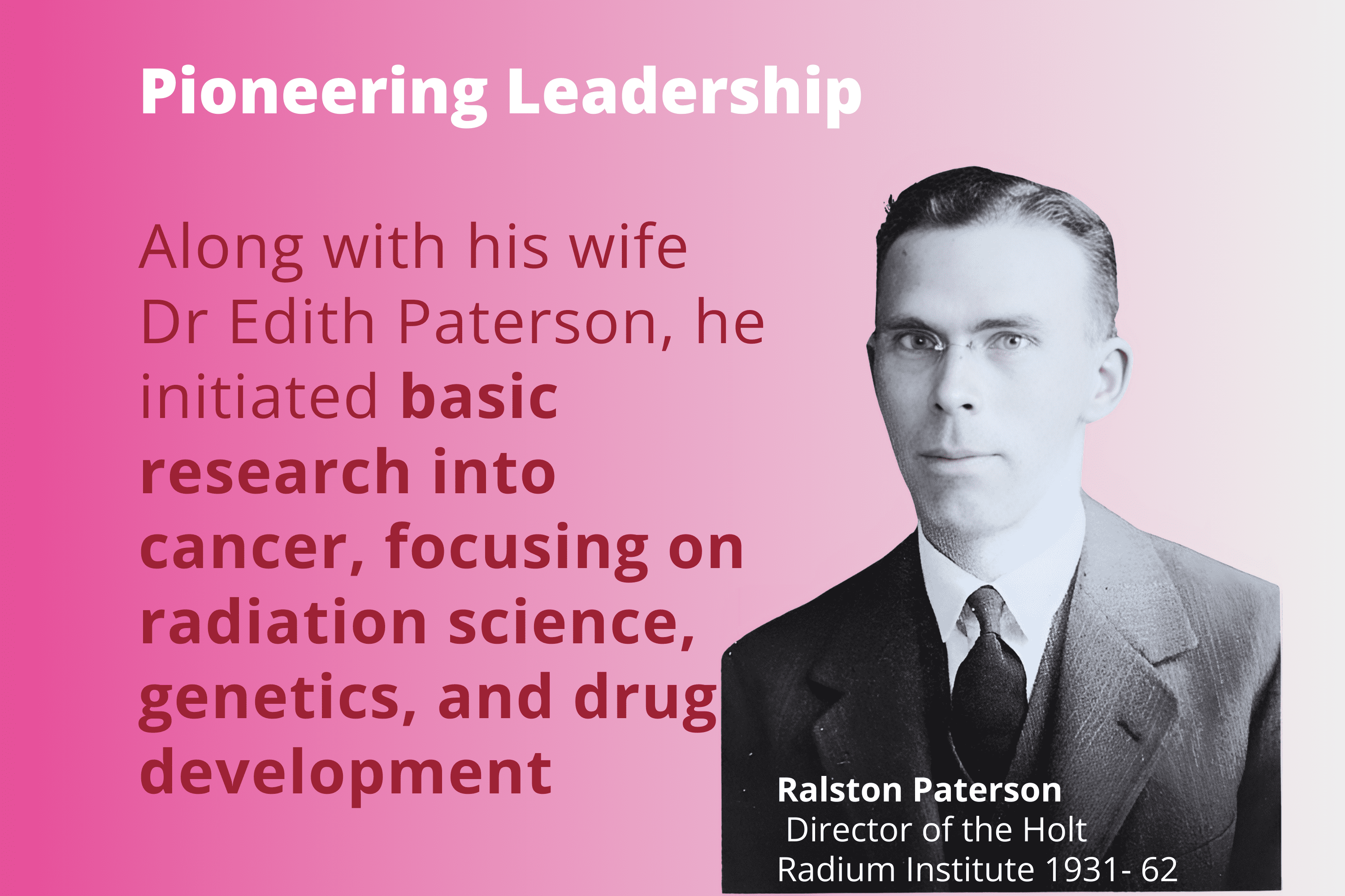 Together with his wife, Dr Edith Paterson, Professor Ralston Paterson established a programme of basic research into cancer, particularly in the fields of radiation science, genetics and drug development.