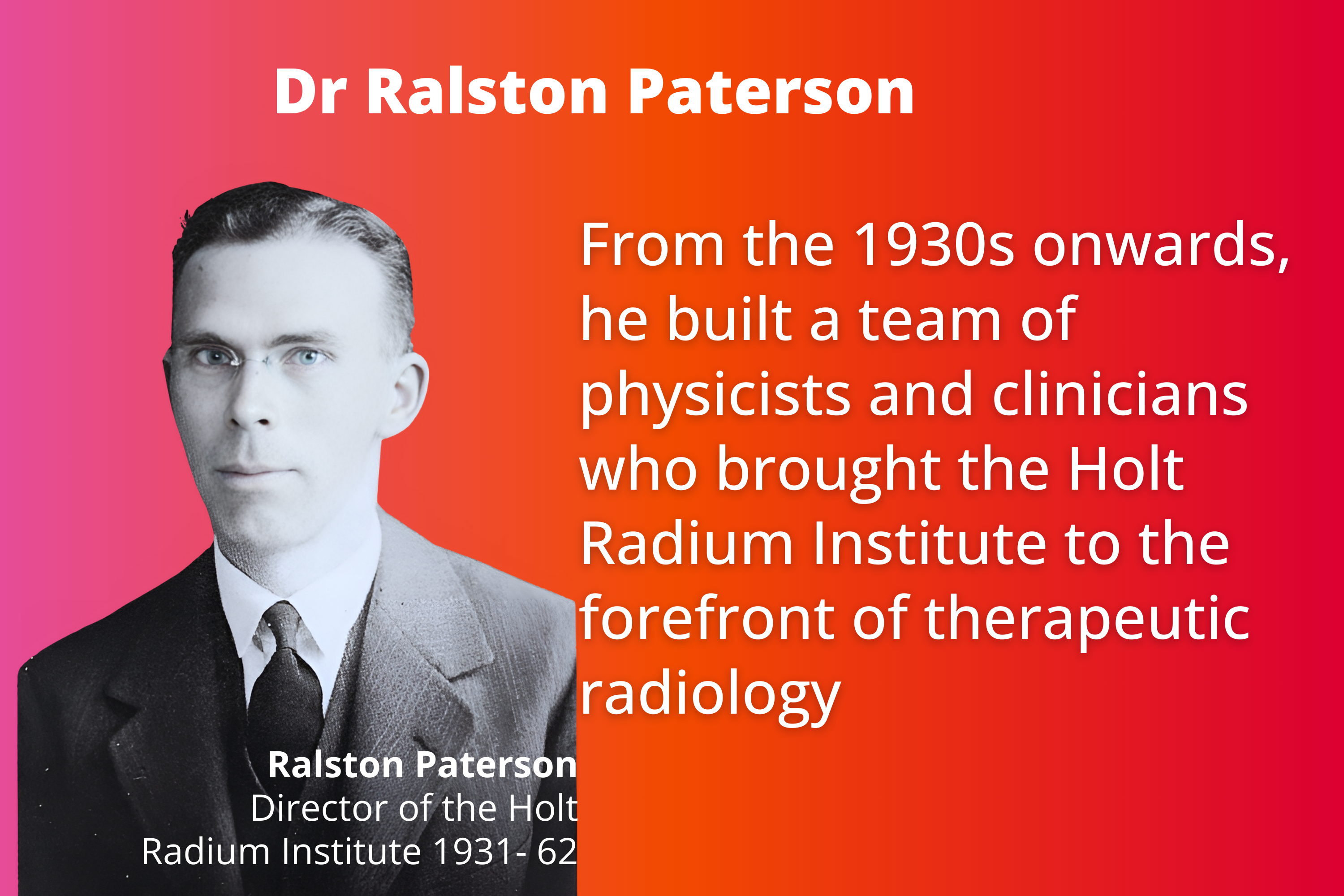 The first Director, Professor Ralston Paterson, was the leading authority in the world at that time in the treatment of cancer by radiotherapy.