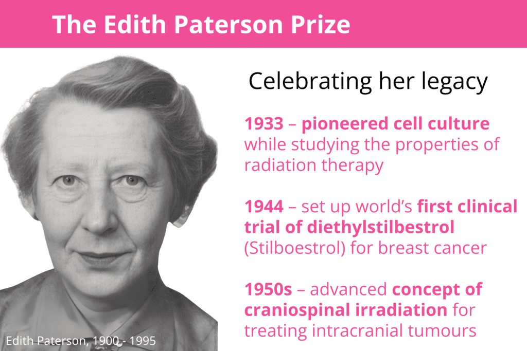 Each year we award this prize in recognition of the most impressive scientific achievements by a student, post-doc or scientific officer and is named after Edith Paterson, who together with her husband Ralston Paterson, made pioneering discoveries in cancer research and treatment in Manchester. The Paterson Building is named after them.